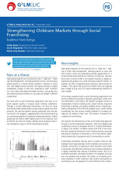High-quality daycare has the potential to be a “triple-win”: fostering child development, increasing parental income, and increasing daycare profits in a mostly female workforce. However, in many low- and middle-income countries, the daycare industry is largely unregulated. Quality is often low especially in poor communities—and raises child safety and health concerns. Low quality may also explain parental hesitancy to use paid care despite a demonstrated need. We work with a social franchising organization that aims to improve daycare quality in Kenyan urban informal settlements. Through a cluster randomized intervention, we find the social franchising model substantially increases daycare quality and meal provision. We also find benefits among competitor firms that did not enroll in the program, suggesting that social franchising maybe a promising approach to generate widespread benefits. Higher quality did not lead to either higher prices or firm revenues, and enrollment also did not change, perhaps because parents have a low willingness to pay or cannot easily observe quality.